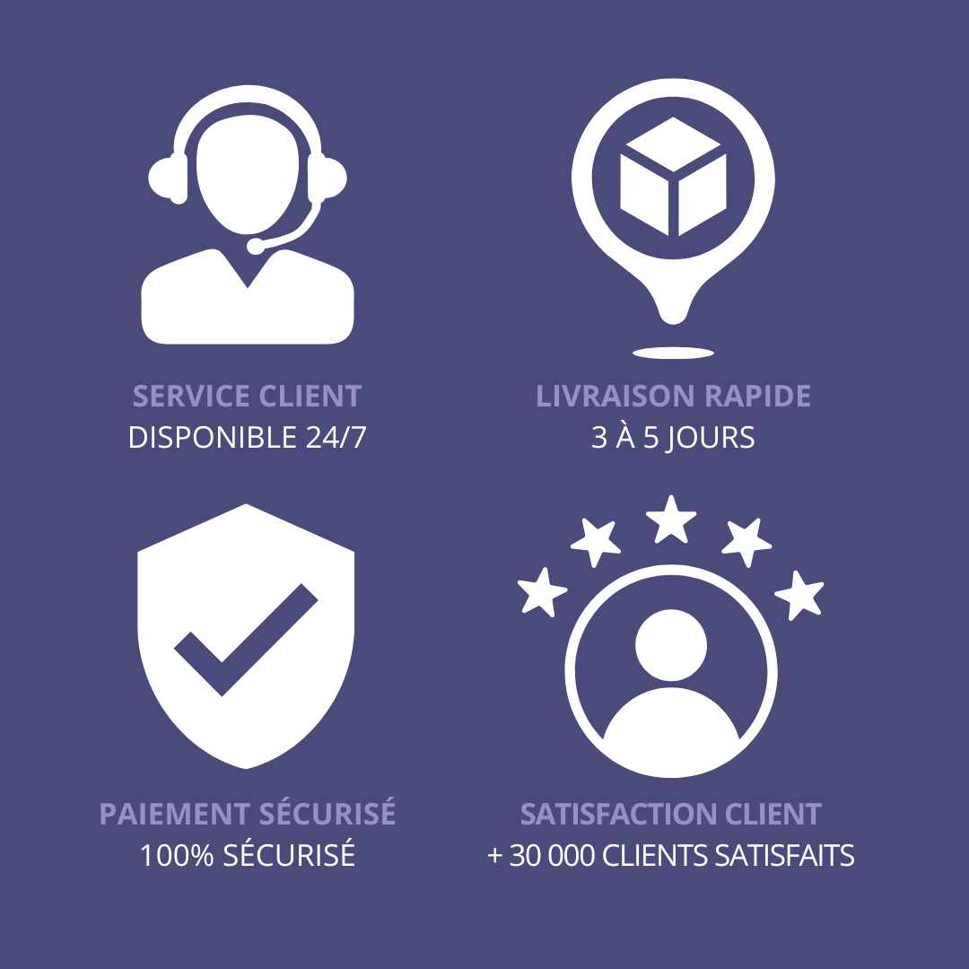 Nos produits sont expédiés sous 24 à 48 heures, puis livrés en 3 à 5 jours ouvrés selon votre région.